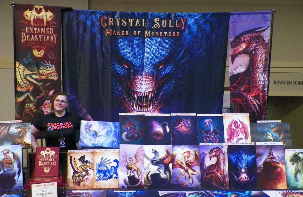 After my business with the vendors on the lower levels was complete, I strode to the upper platform of the big floor. I think there was six or seven vendors up here. I believe the lower part had between eight and twelve. The booth which caught my attention had two tables filled left to right with art prints and rubber mats. A book titled “The Untamed Beastiary,” was on display along with a few copies for sale. The banner behind the stall was…a-hem…crystal clear: Crystal Sully, Maker of Monsters.