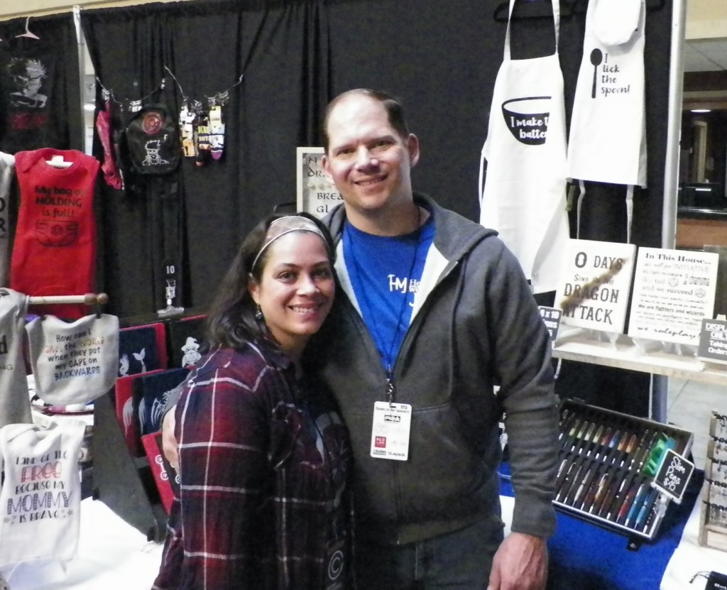 Once the merchants were up and open, I loitered around the booths on the lower floor next to the hotel’s check in counter. Let it not be said that merchandise wasn’t plentiful at the convention. Most vendors were selling arts, crafts, and curios. Some some were advertising their game products. A couple were even selling clothing. It was surprisingly enjoyable to see entrepreneurs doing business.