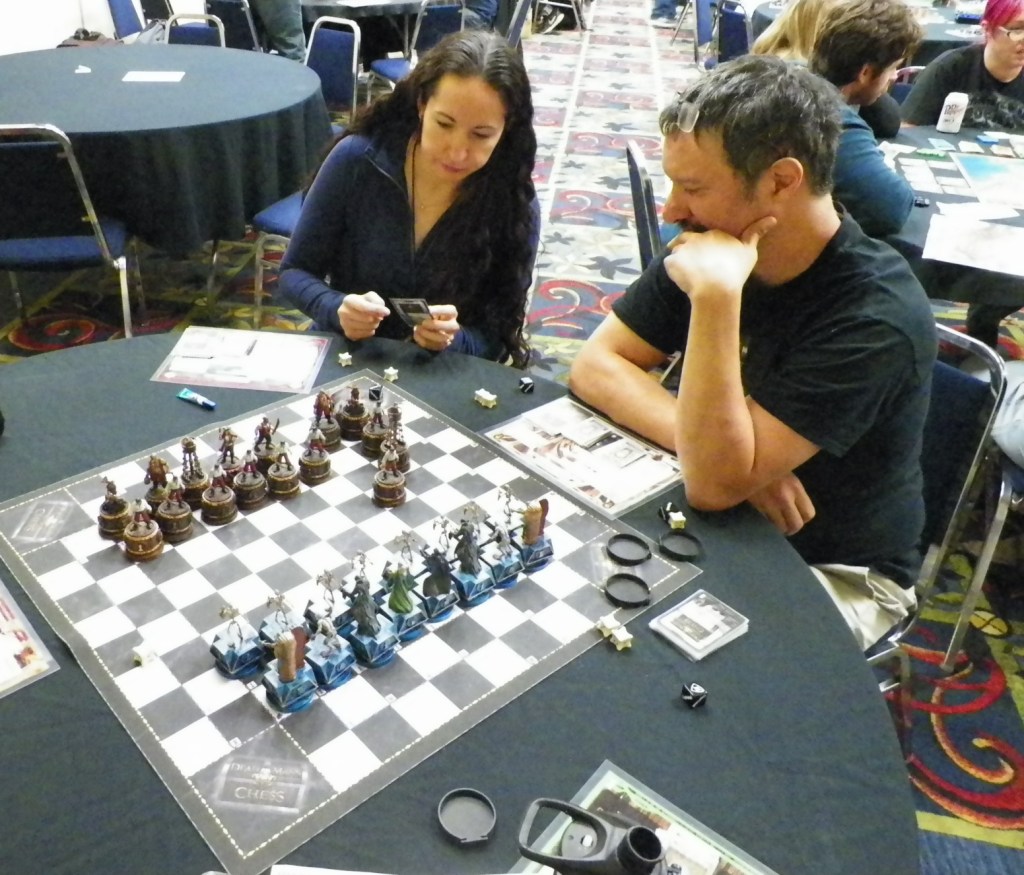 The game lasted about four hours. After completion, I returned to the board game ballroom at the back of the convention hall. My goal there was twofold. First, I was going to try and record the last big game of Oathen and get practice with video. Second, I wanted to try my hand at a game called Dead Man’s Chess which interested since day one of the convention. A bonus to doing a feature about Dead Man’s Chess was that one of the designers was also the game master for the podracing event the night before: Mr. Virgilio San Andres