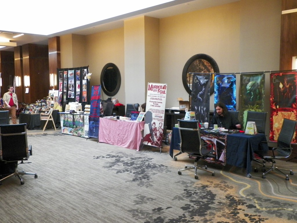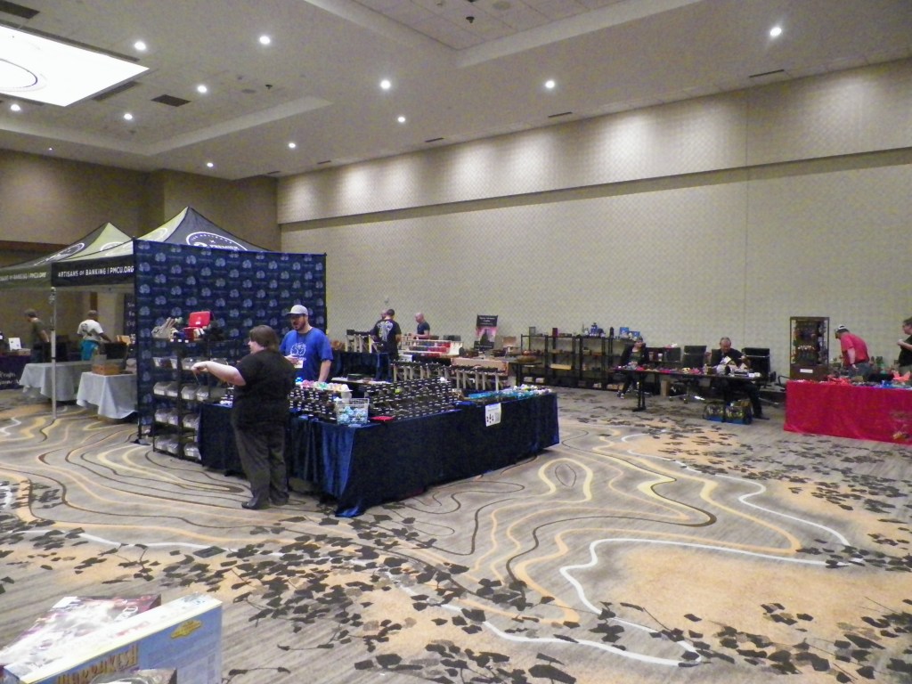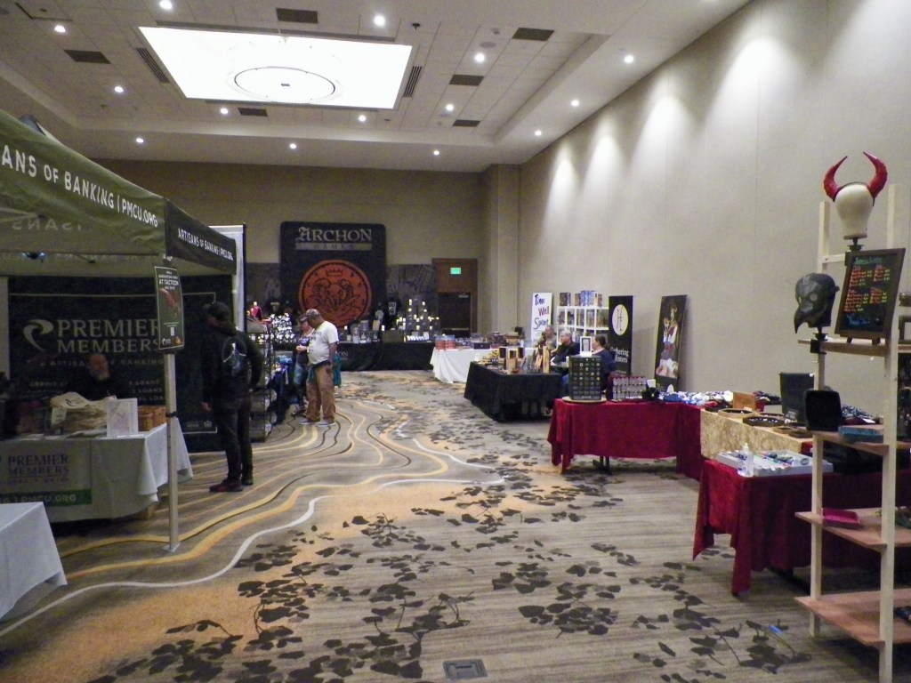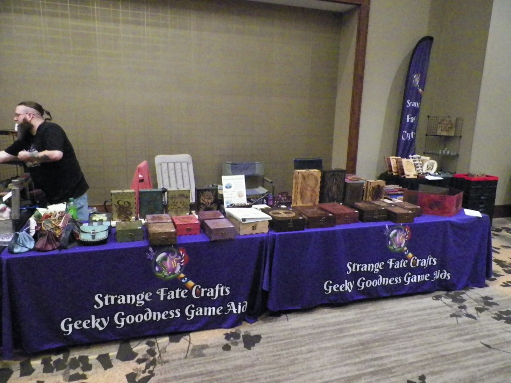 The second day dawned with little problem. My first event for the day, a rules demo and subsequent play session, wasn’t expected to start until around 11:00. Thus, I decided to revisit the vendor hall. The space was a who’s who of friendly faces: the long-known Strange Fate Crafts, the designers Archon Games and Sixpence Games from GhengisCon, Amatus Kadan and Wooded Meadow Gaming from CGC back in April, and last but no means least, the well-met ELC Custom Creations and Iomnisus Limited.