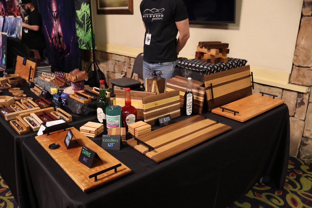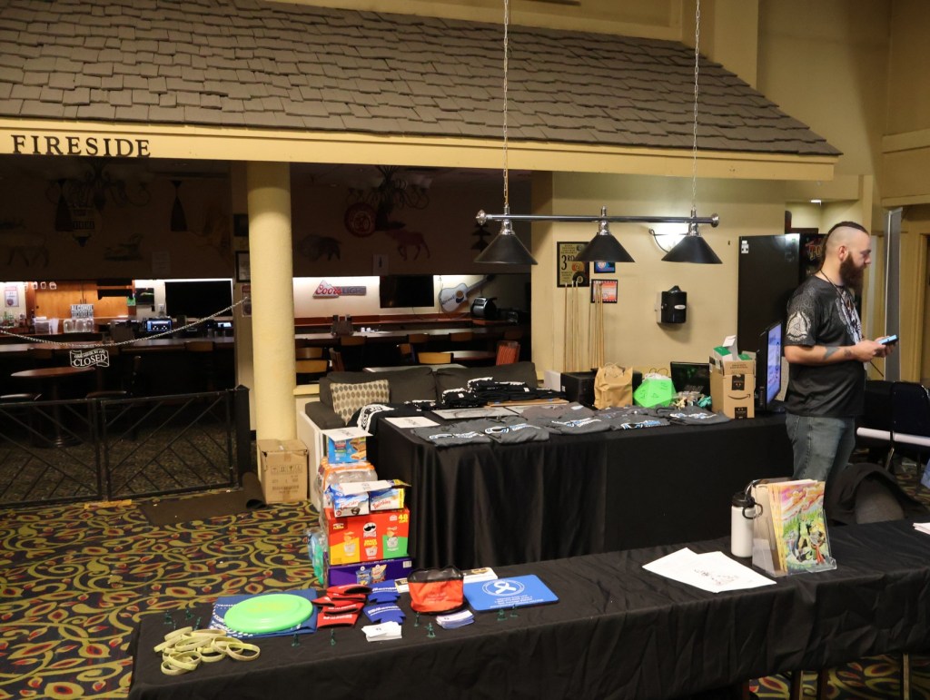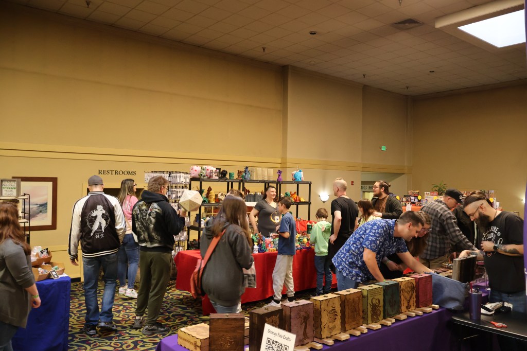 Saturday morning started free and clear. I left the hotel to collect some take-out breakfast, then returned to browse the craftsmen and craftswomen who came to sell their wares. With some prodding from the Castle Bravo gentlemen, I collected my first and second interviews from a pair of Wyomingites: Mr. Justin Johnson of Narfox, and Mr. Peter Sieler of Yub Nub Games.