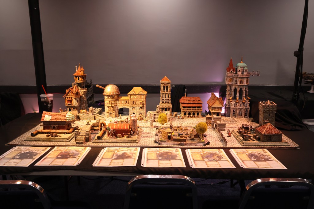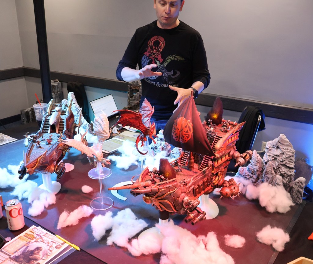 My afternoon was dominated by participation in a Hazard Quest-sponsored game called, “Flight of the Talonfire.” The premise was that the land’s beloved king had been murdered and his daughter was the prime suspect. However, she claimed innocence. Our party, who had previously worked for the deceased king, was hired to break her out, steal a brand-new airship–the namesake Talonfire–and set off for an underground city called Death’s Hold.