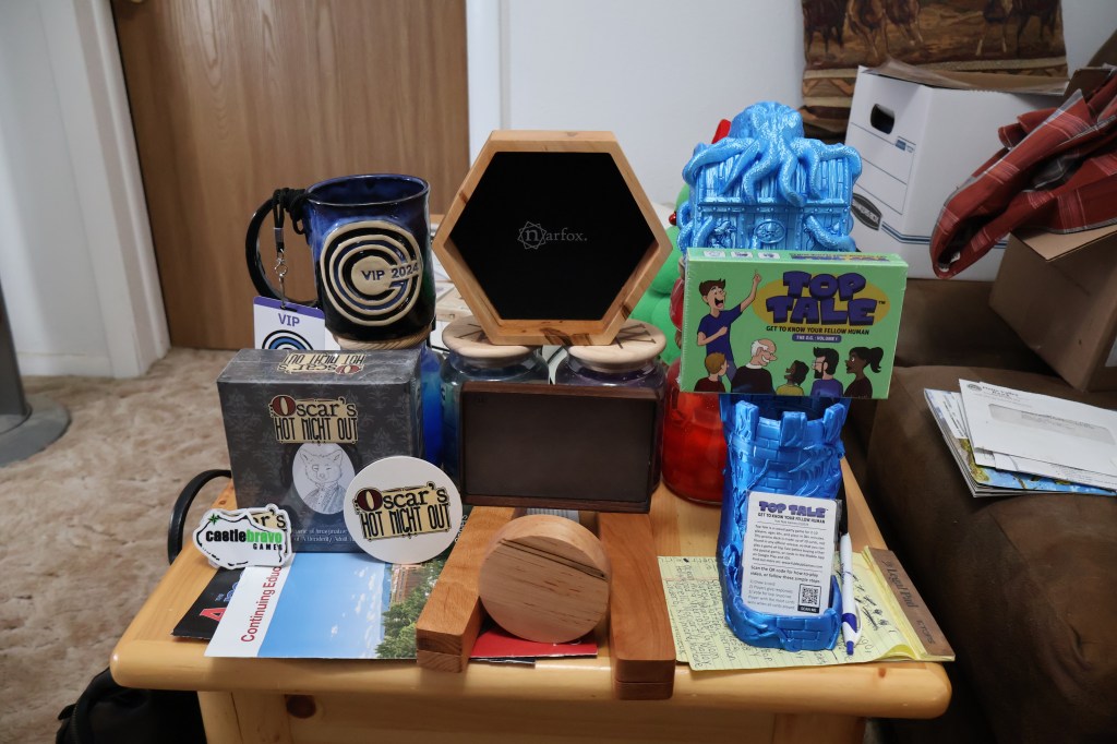 My visit to Cheyenne Gaming Convention was a full success. In addition to merchandise from my interviewees, I collected mementos from Crystal Sully, the Wyoming Gaming Library, and Amatus Kaden. For now though, it is time to go silent. There is a convention in my alma mater town of Laramie WY on May 11th and 12th, but I don’t know if I’ll do a story on that. The next convention that I am confident I will cover is Fort Collins Comic Con in August. Until then, stay safe everybody.