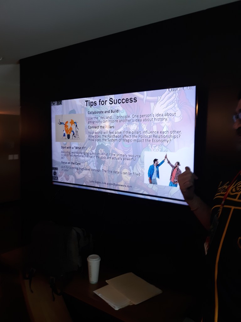 For one hour, I got to learn at the feet of the son of one of the creators. And the topic to learn about was worldbuilding. Luke drew on his experience from being in the U.S. Army and divided the craft into eight pillars. Following the presentation, the participants were split up into groups and challenged to create a world using the pillars we just learned about. My group created a mashup of Tatooine and Arrakis with an ice-band equator, ruled between a technocratic scholarship and traditional merchant princes. After the project was done, Luke promoted GaryCon happening in Wisconsin and had a limited supply of merchandise for sale. I snapped up a dice set for $20.