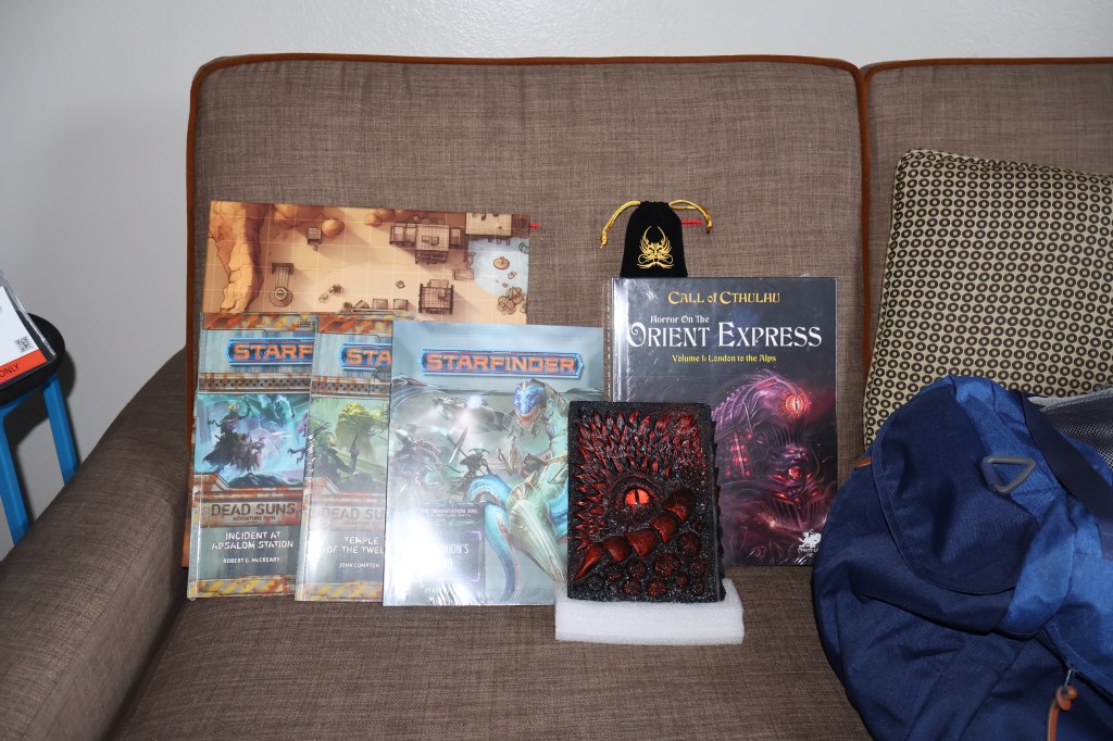 After completing the Nimble RPG session, the vendor hall was only open for another hour, so I began scouring for last-minute buys. A vendor which I surprisingly gravitated toward was Honest Mike’s Wall O’ Wonders. Mike was a jovial gentleman and his booth presented the atmosphere of a local store selling a little bit of everything–books, prints, swords, dice, maps, etcetera. I bought quite a bit from the Wall, including Call of Cthulhu and Starfinder adventure books, and a reversible desert-forest battle-map box.